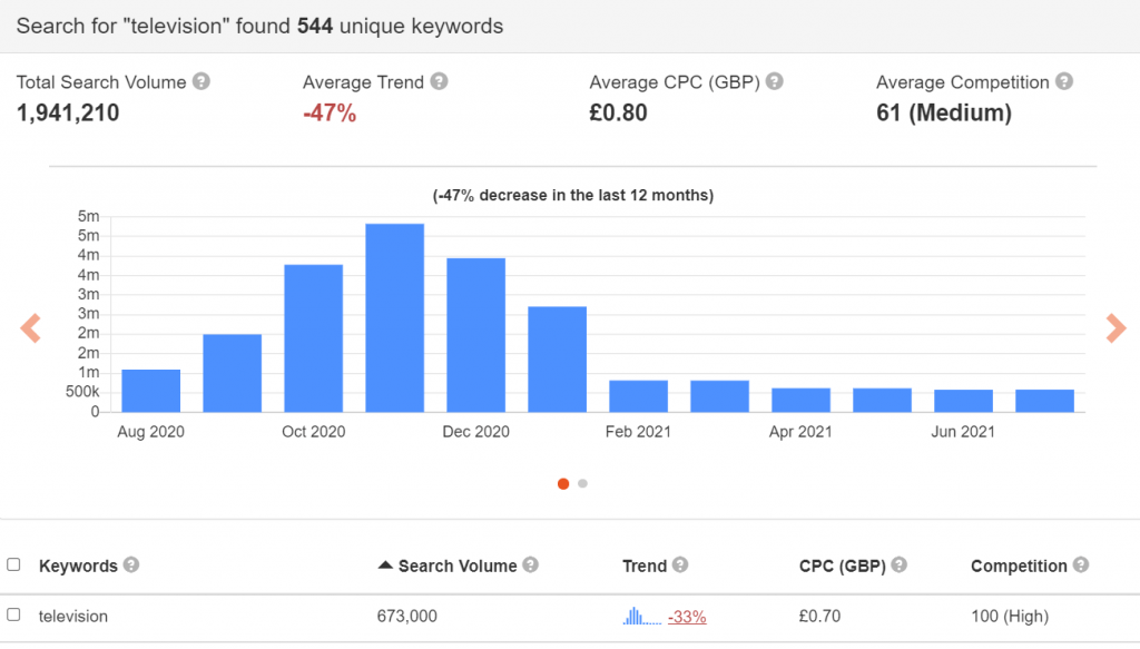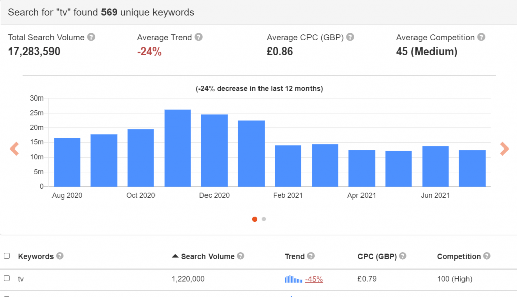 If there’s anyone that understands your business and the products or services you sell, that would be you. So don’t forget to use your own knowledge. Most often SEO keywords are quite logical, or at least, the high volume ones are. Just think for yourself “What would I search for if I was looking for my product/service?”. Write these down on a list and just keep going until you feel like you’ve written down the ones you think are logical. For example: You might start off with “Television”. Logically you will add “TV” next. If you keep thinking you will start adding words to it: “Smart TV”, “Buy TV”, “Buy TV online”.